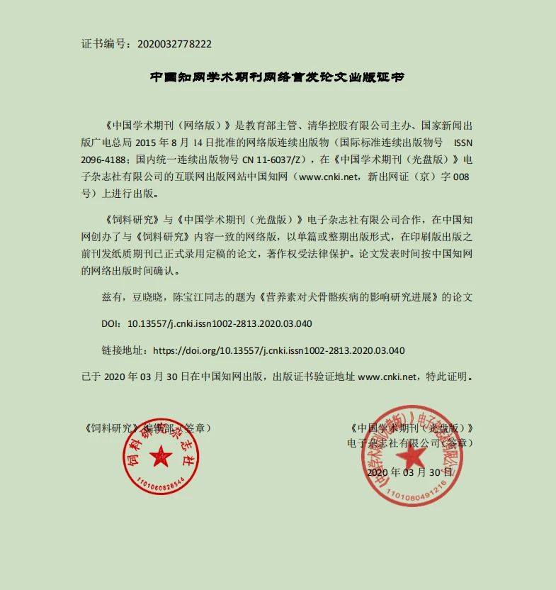 華興寵物食品研發(fā)部論文《營(yíng)養(yǎng)素對(duì)犬骨骼疾病的影響研究進(jìn)展》在北大核心期刊《飼料研究》上發(fā)表,并可在中國(guó)知網(wǎng)上檢索。